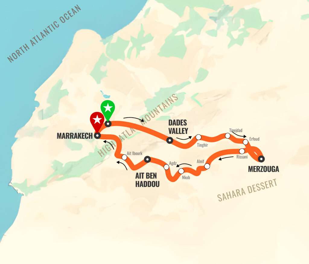 Visit the iconic Kasbah El Glaoui, also known as the “Eagle’s Nest,” before enjoying lunch in the valley. Afterward, head back to Marrakech via the breathtaking High Atlas Mountains, where scenes from the famous Mission Impossible motorbike chase were filmed. Upon arrival in Marrakech, our crew will drop you off at the nearest parking area to your accommodation (if booked separately), marking the end of your unforgettable desert adventure.